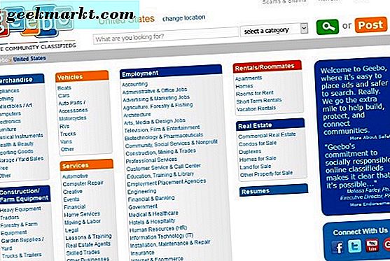 Aptal isim bir yana, Geebo aslında oldukça iyi. Başka bir minimalist sınıflandırılmış web sitesi ve çok çeşitli kategorileri kapsayan Craigslist alternatifi. İşlerden teknelere, evcil hayvanlardan karaya, burada her şeyden biraz var. Geebo, Craigslist'den daha iyi küratörlüğünü yapıyor. Orada hâlâ saklanmakta olan sahtekarlıklar olsa da, onları rapor etmek ve onları kaldırmak basittir.
