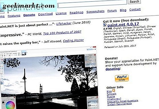 Paint.NET, web sitesine giriş yaptıktan sonra indirim yapmak kolaydır ancak azim, kullanımı en kolay, en hızlı resim editörlerinden biri ile sizi ödüllendirecektir. Tamamen ücretsiz ve sürekli geliştirildi ve daha hafif bir çalışma için Photoshop'a çok inandırıcı bir rakip.