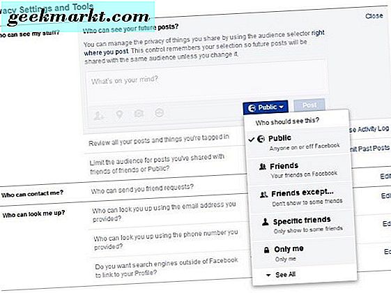 Yayınların profilinize benzer gizlilik ayarları var. Bunları, Özel arkadaşlar, Yalnızca belirli arkadaşlar ve Yalnızca ben de dahil olmak üzere Genel, Arkadaş, Arkadaş olarak ayarlayabilirsiniz. Kamu gerçekten sadece işletmeler veya aşağıdakileri yapmak isteyenler içindir. Ortalama kullanıcı, gönderilerin ayarları dışındaki Arkadaşlar veya Arkadaşlar'ı kullanmalıdır. Grupların bir üyesiyseniz, aynı zamanda gizliliği ayarlarken de bir seçenektir.
