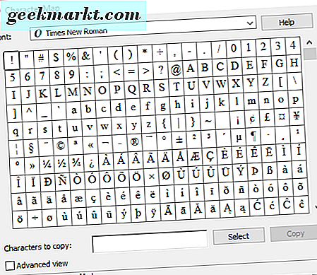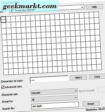 Orada panoya kopyalamak için seçebileceğiniz bir karakter ve sembol ızgarası var. Gelişmiş görünüm onay kutusunu tıklayın ve ardından arama kutusuna 'dash' yazın. Arama düğmesine basın ve doğrudan aşağıda gösterildiği gibi em dash kutusunu tıklayın.