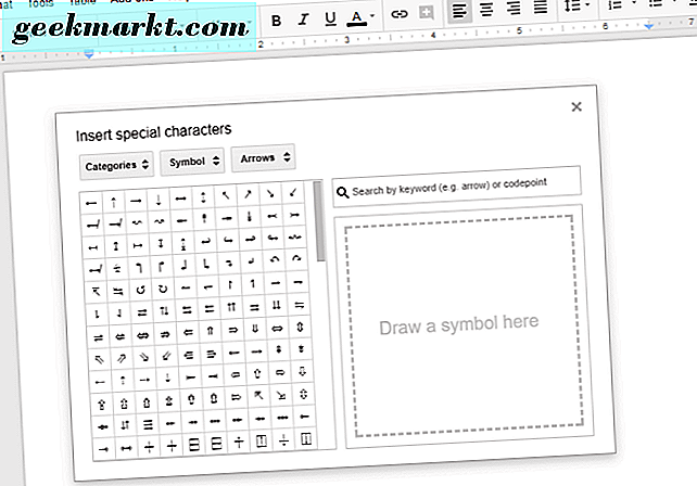 Google Dokümanlar ayrıca, dokümanlara kısa çizgiler ekleyebileceğiniz bir karakter penceresine de sahiptir. Bu pencereyi açmak için Ekle ve Özel karakterler'i tıklayın. Bu, doğrudan aşağıda gösterilen pencereyi açacaktır.