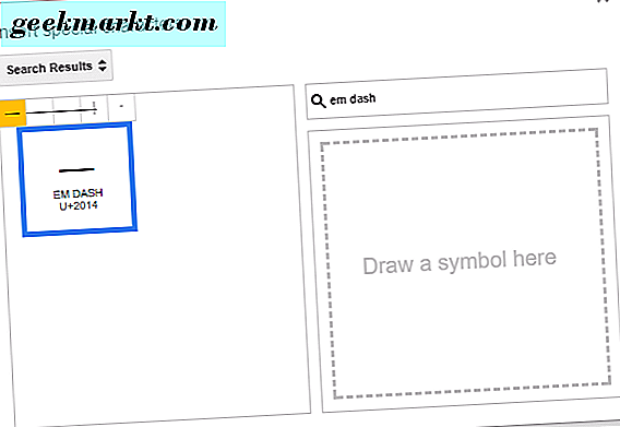Google Dokunun Özel Karakterinin Penceresinden Em Dash seçeneğini belirleyin.