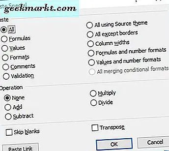 Ardından, köprüyü içeren hücreyi seçin, aksi halde B3. Bu hücreyi sağ tıklayıp doğrudan aşağıda gösterilen pencereyi açmak için Bağlam menüsünden Özel Yapıştır> Özel Yapıştır seçeneğini belirleyebilirsiniz. Bu pencerede Çoğalt'ı seçin ve köprüyü kaldırmak için Tamam düğmesine basın. Ardından elektronik tablodaki B3 hücresinin seçimini kaldırın.